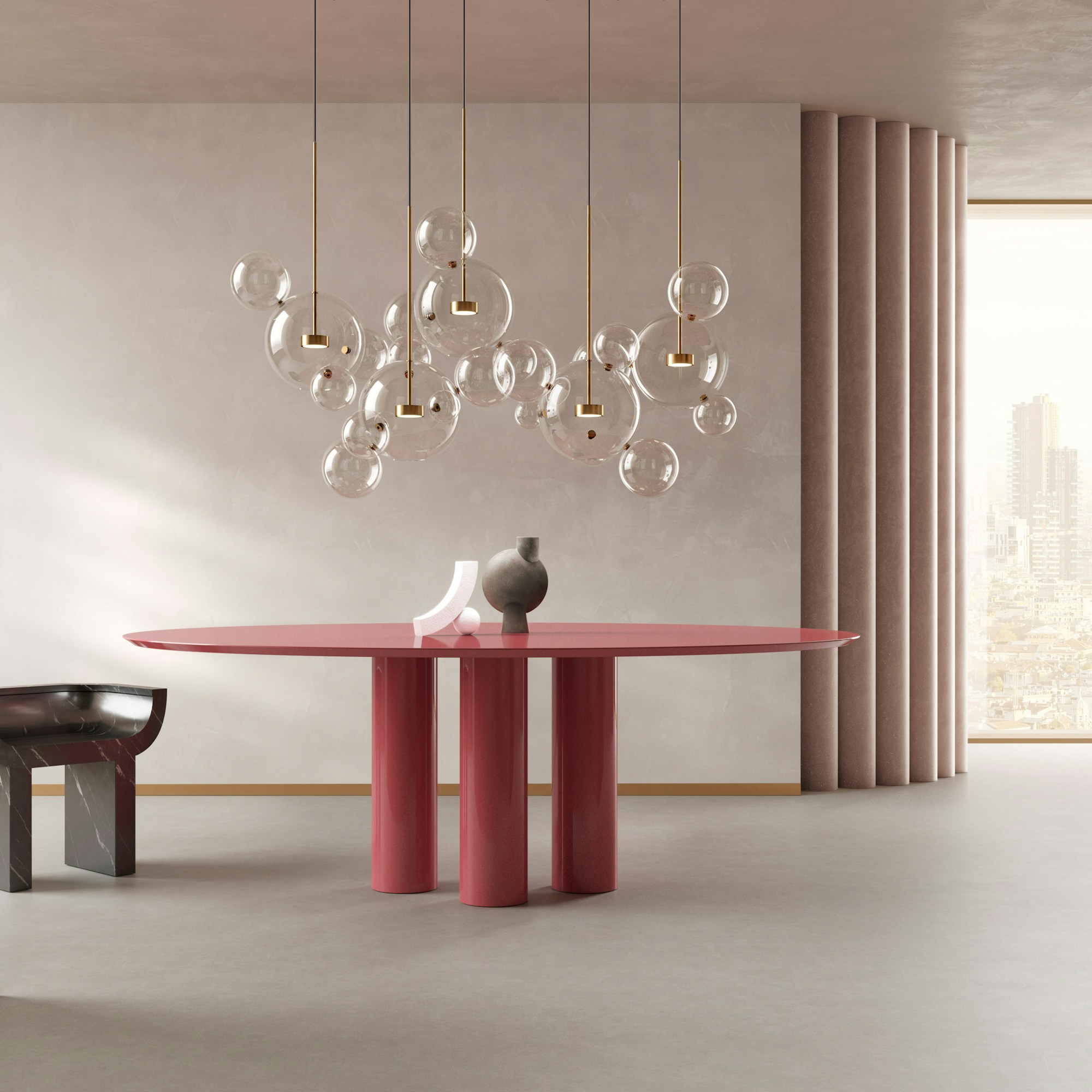 Bolle collection presents different compositions, where the glass spheres interact up and down with the space.