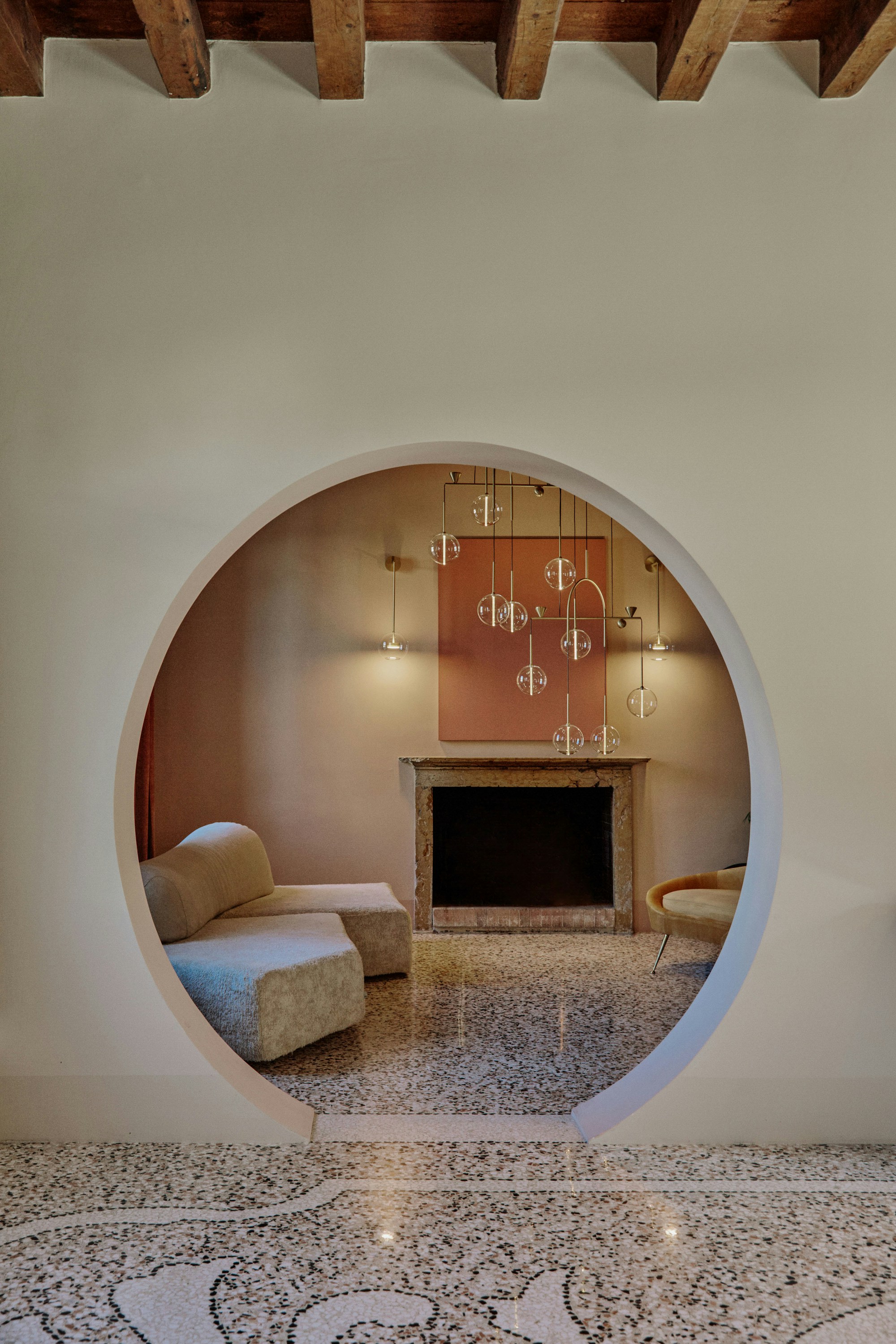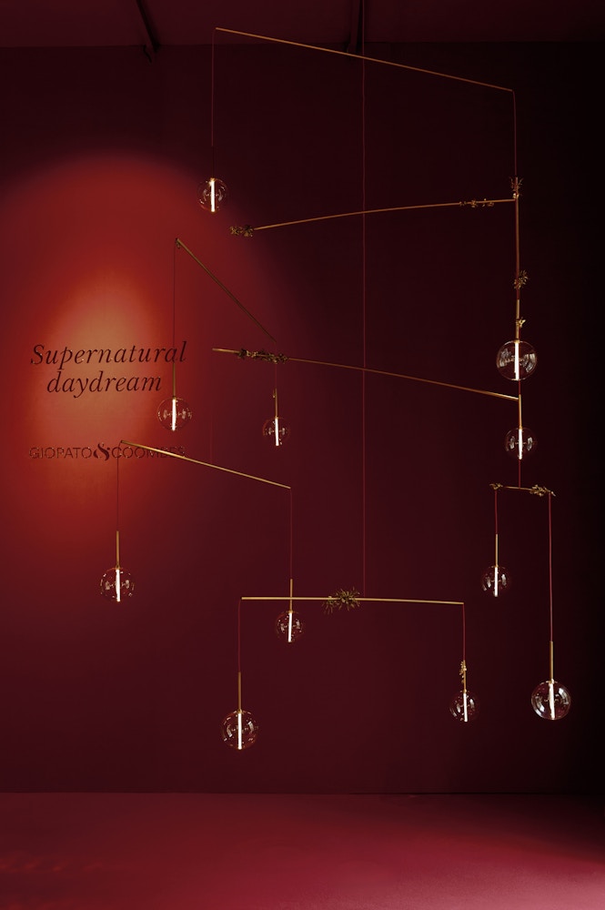 With innate compositional freedom, the Dewdrops chandelier combines rigorous structure with lightness. It is a modular mobile chandelier that extends into space. Custom creations have been designed, as if a constellation of dots hovering, to move slowly within space.