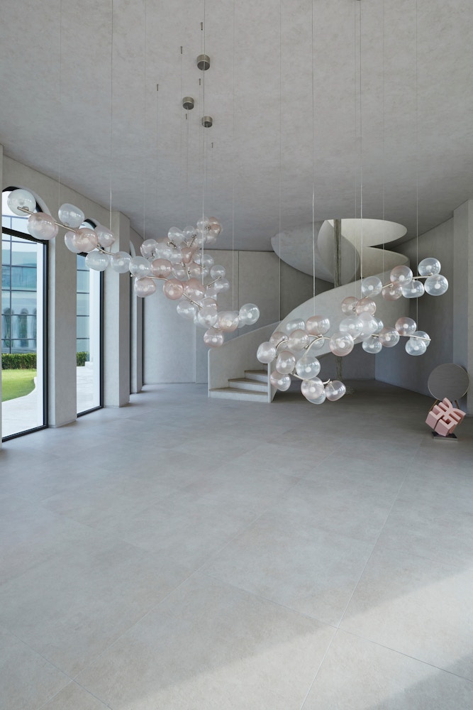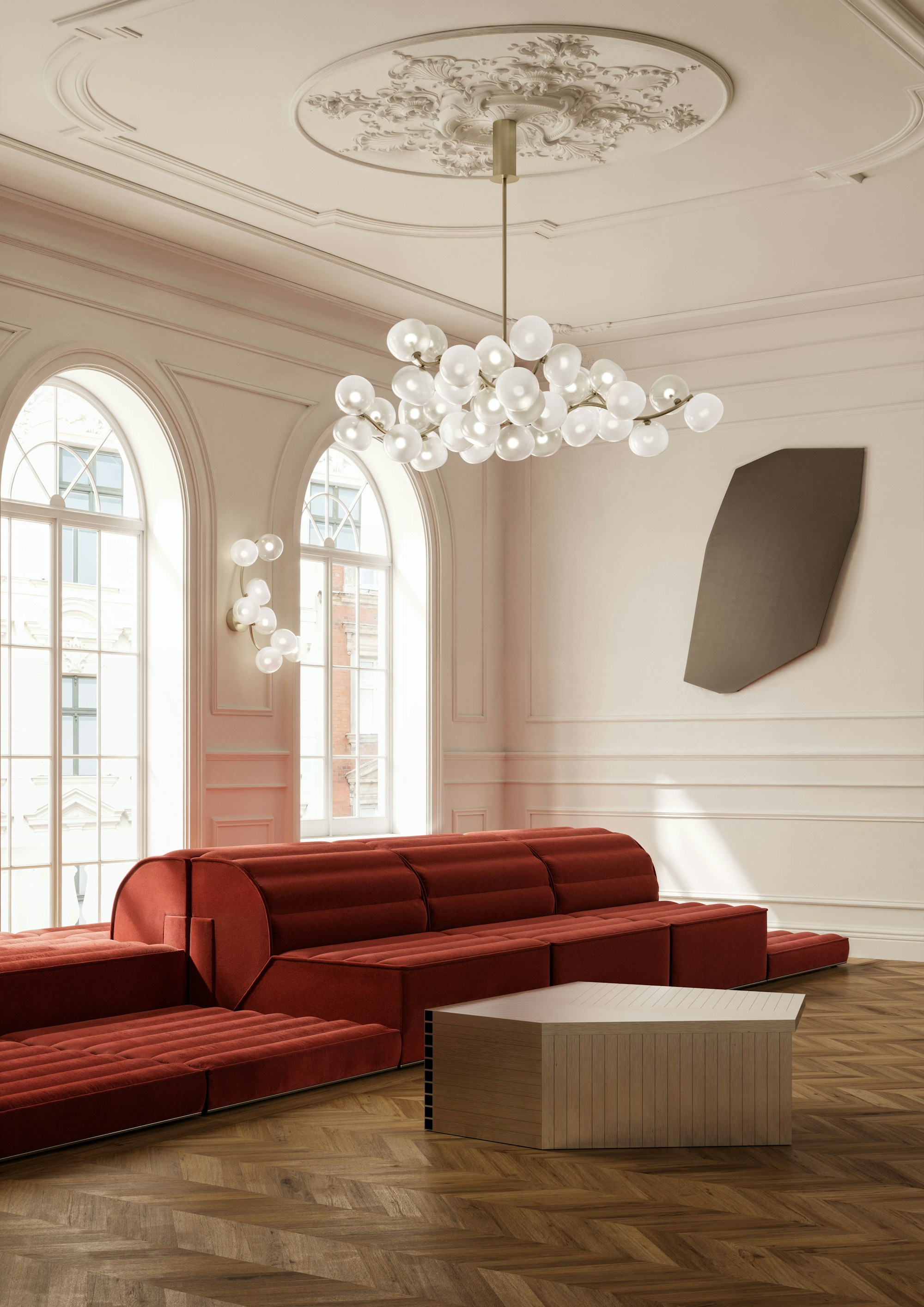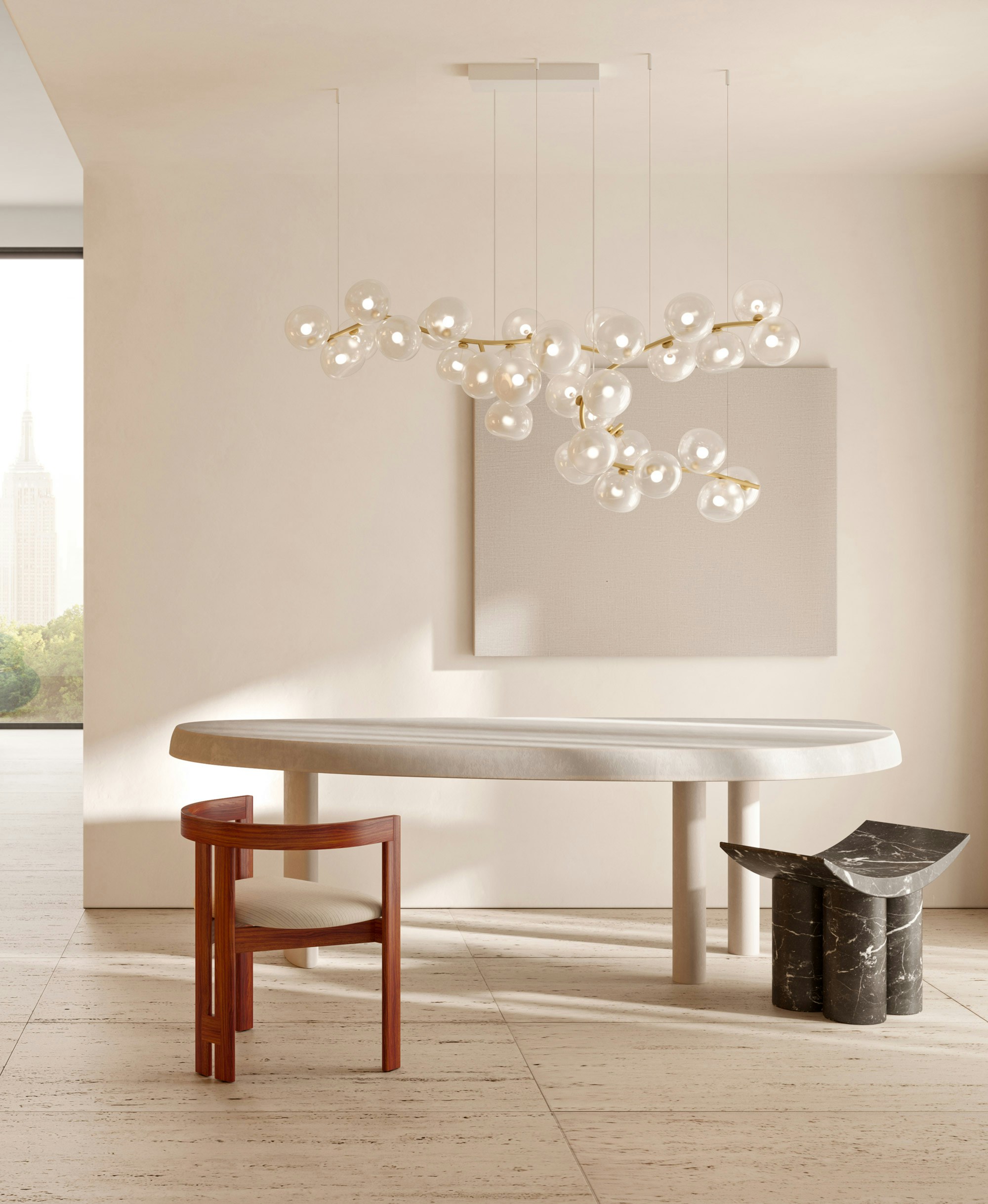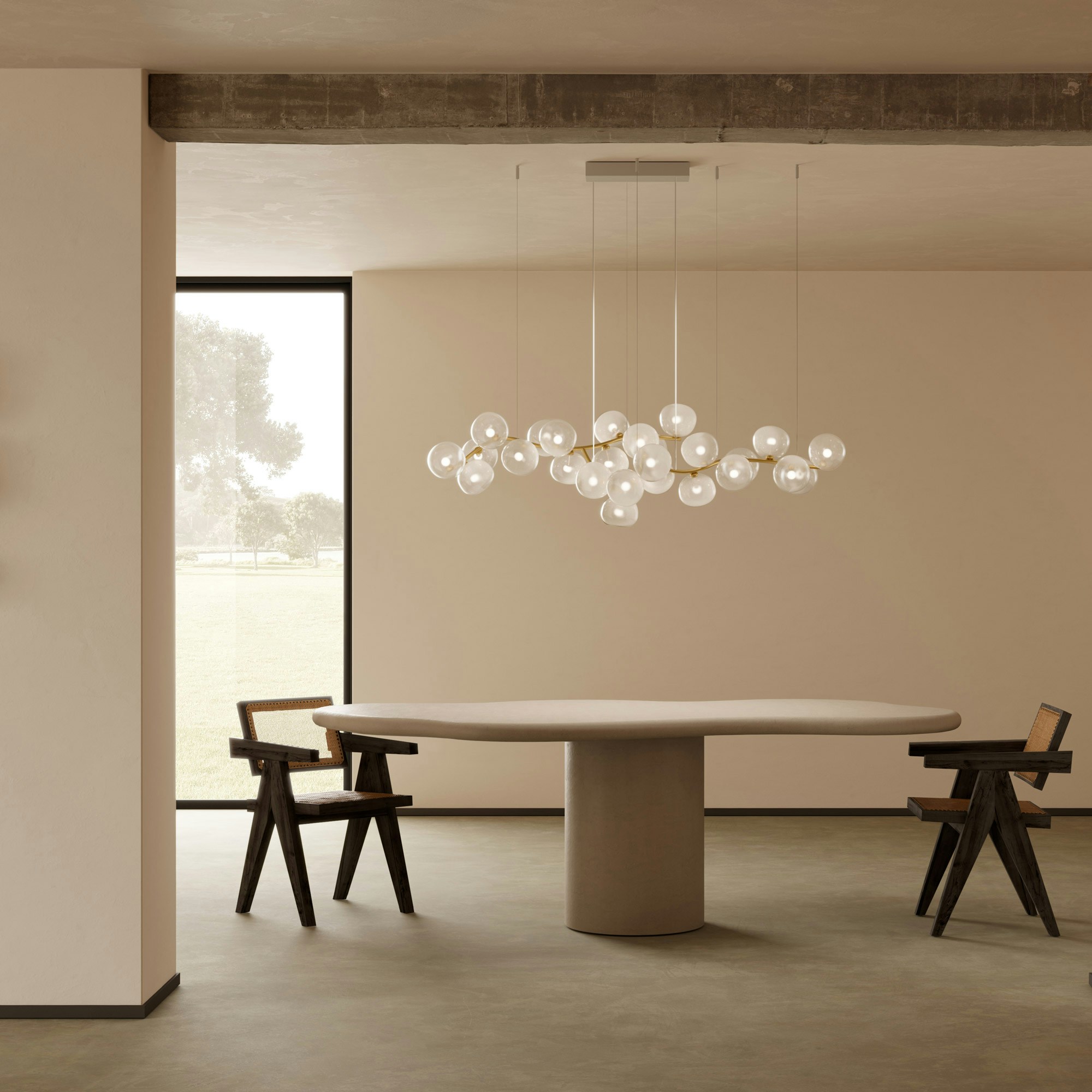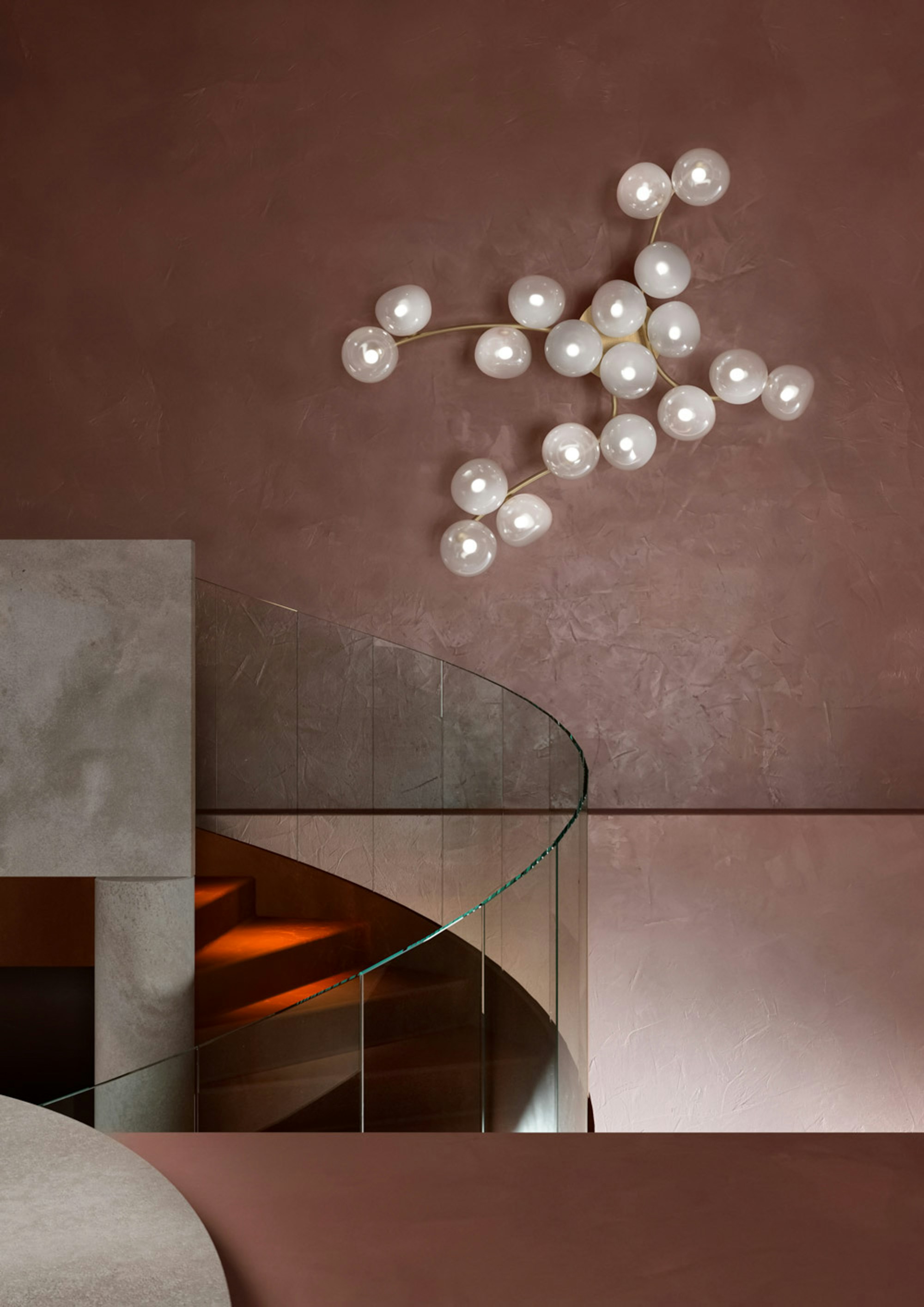 Between nature and abstraction, searching for a compositional balance between the elements, it is possible to play with extension and presence across space, with modular custom-made creations. Glass sphere shades are also available for customizable options.