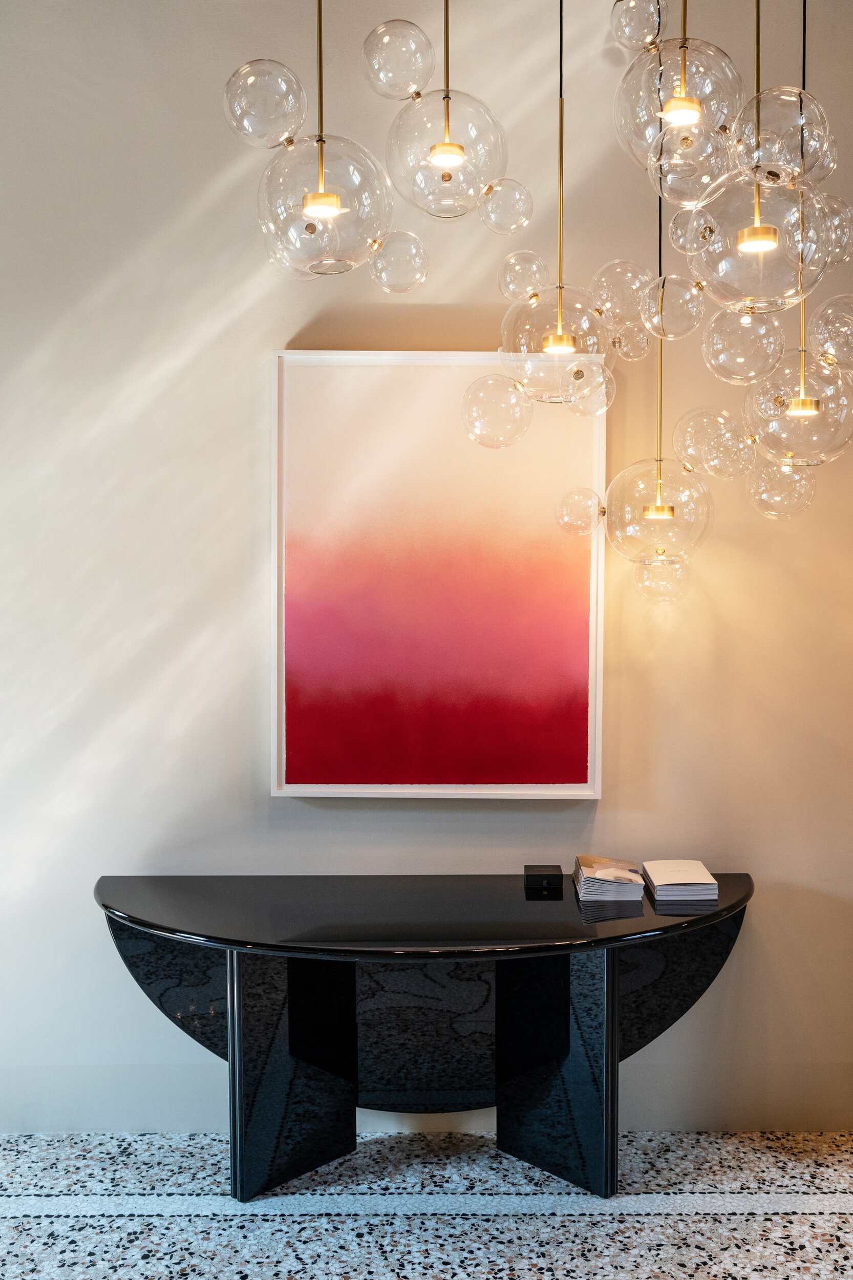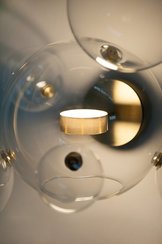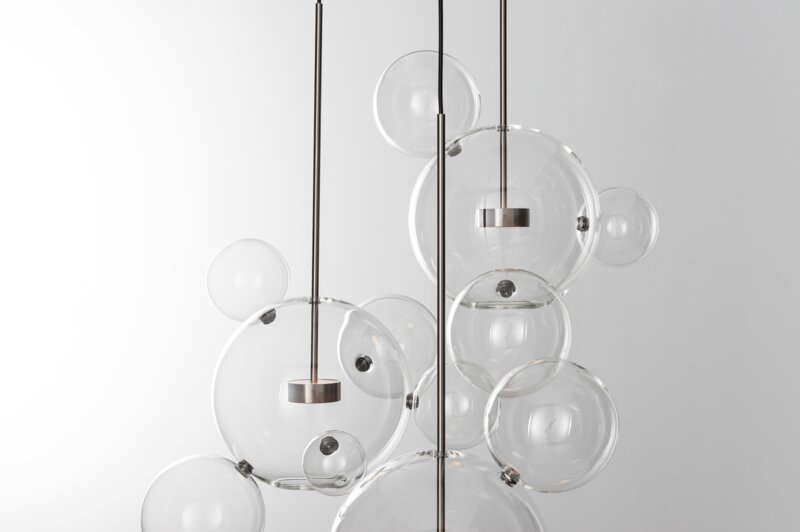 Mentre la versione trasparente gioca con il vuoto, quella dall'effetto satinato lavora con il volume pieno delle sfere, creando forme rotonde simili a nuvole che sembrano crescere e muoversi insieme nello spazio.