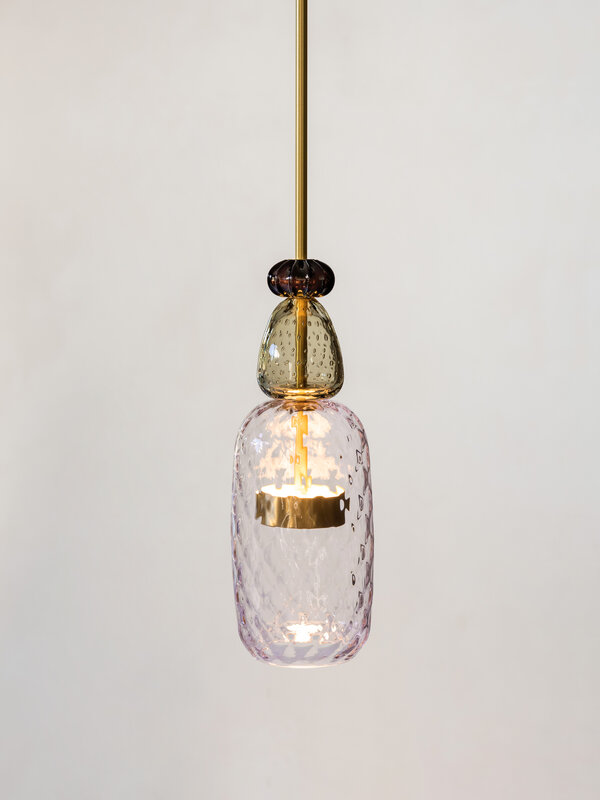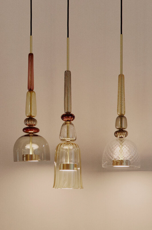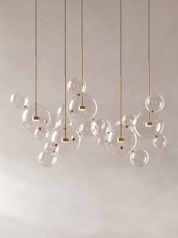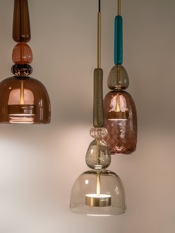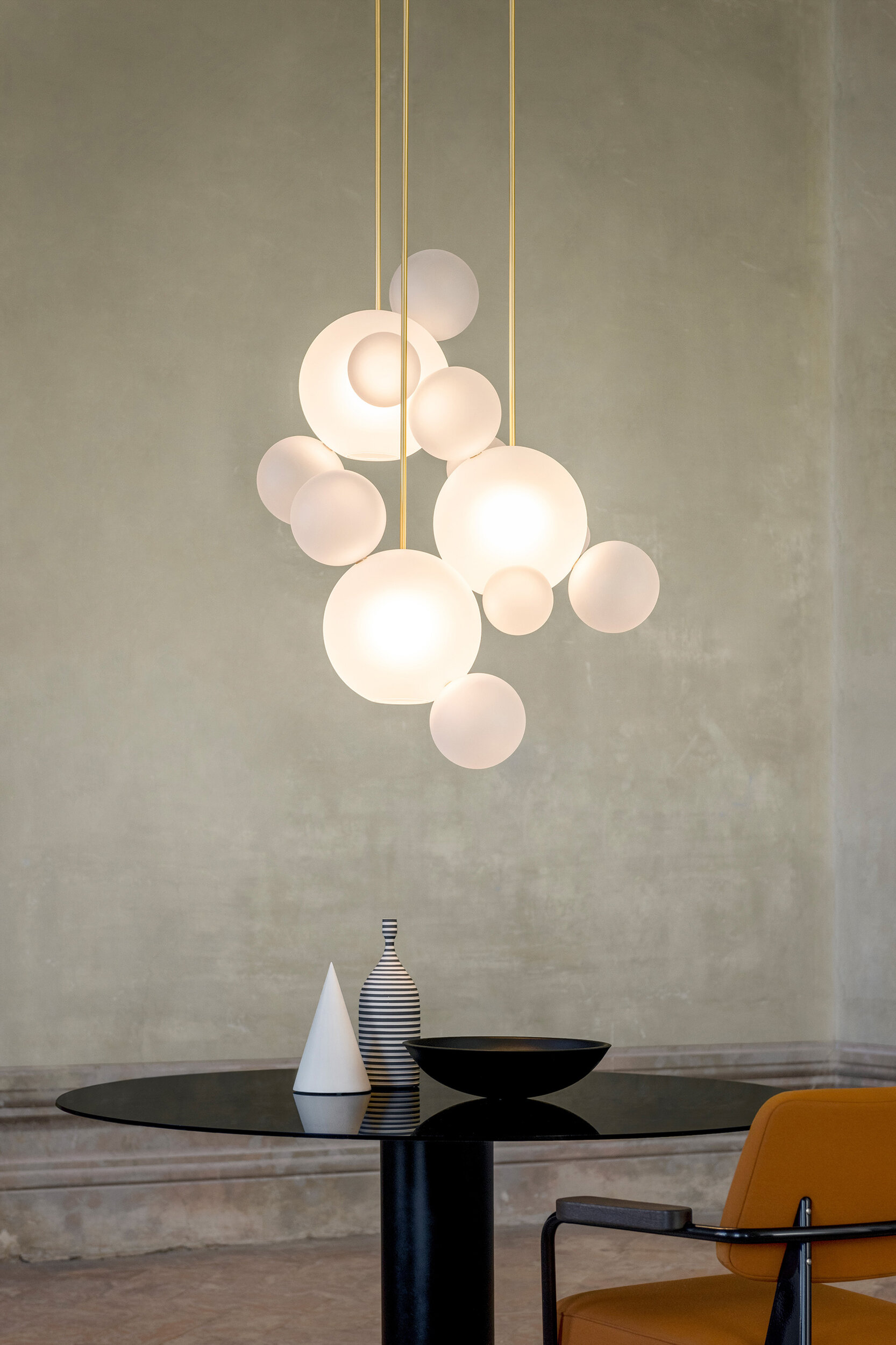 La collezione Bolle Frosted presenta diverse composizioni e accostamenti dimensionali. Le morbide sfere di vetro dal colore bianco sfumato interagiscono in un movimento su e giù, armonizzando l'effetto di luce soffusa nello spazio abitativo.