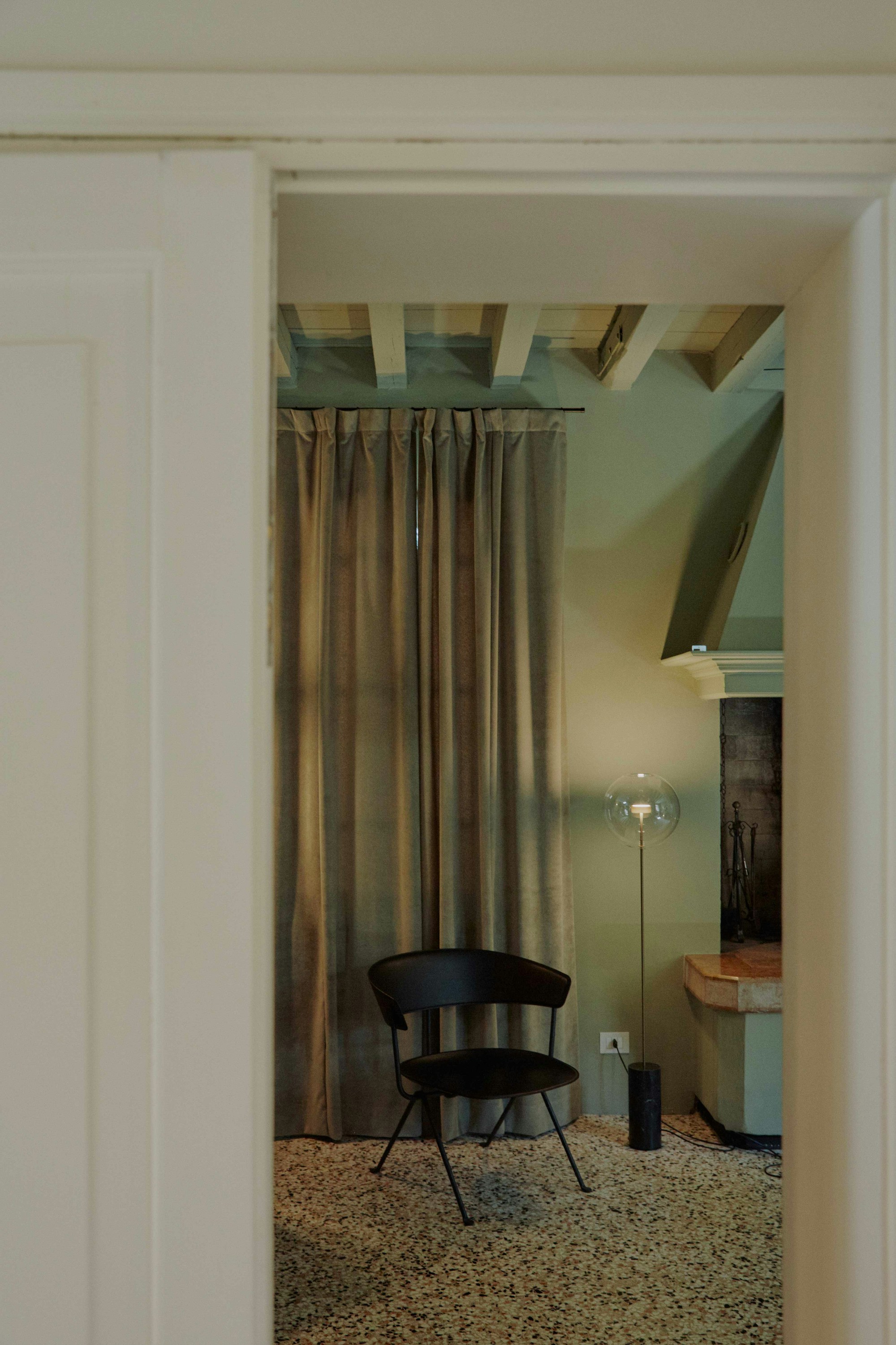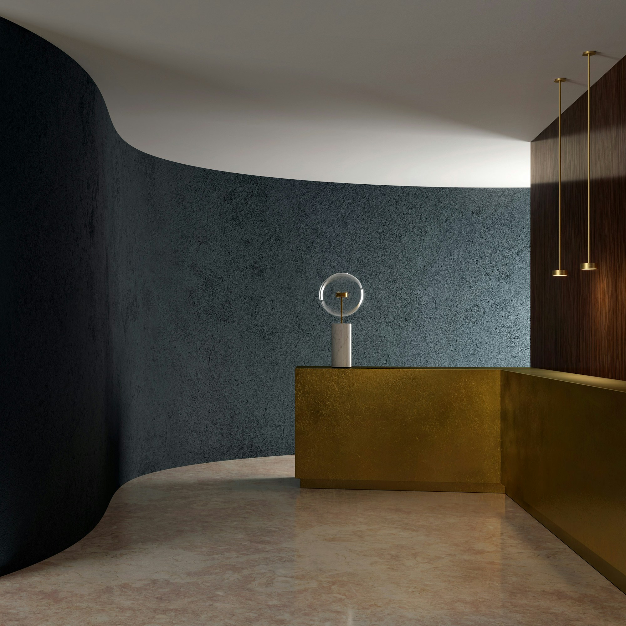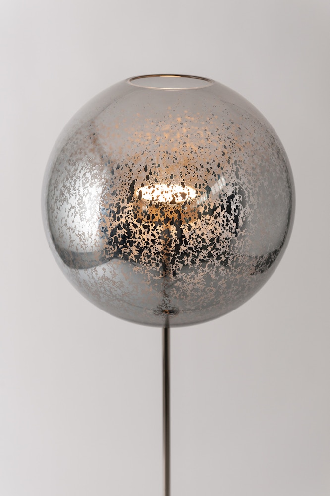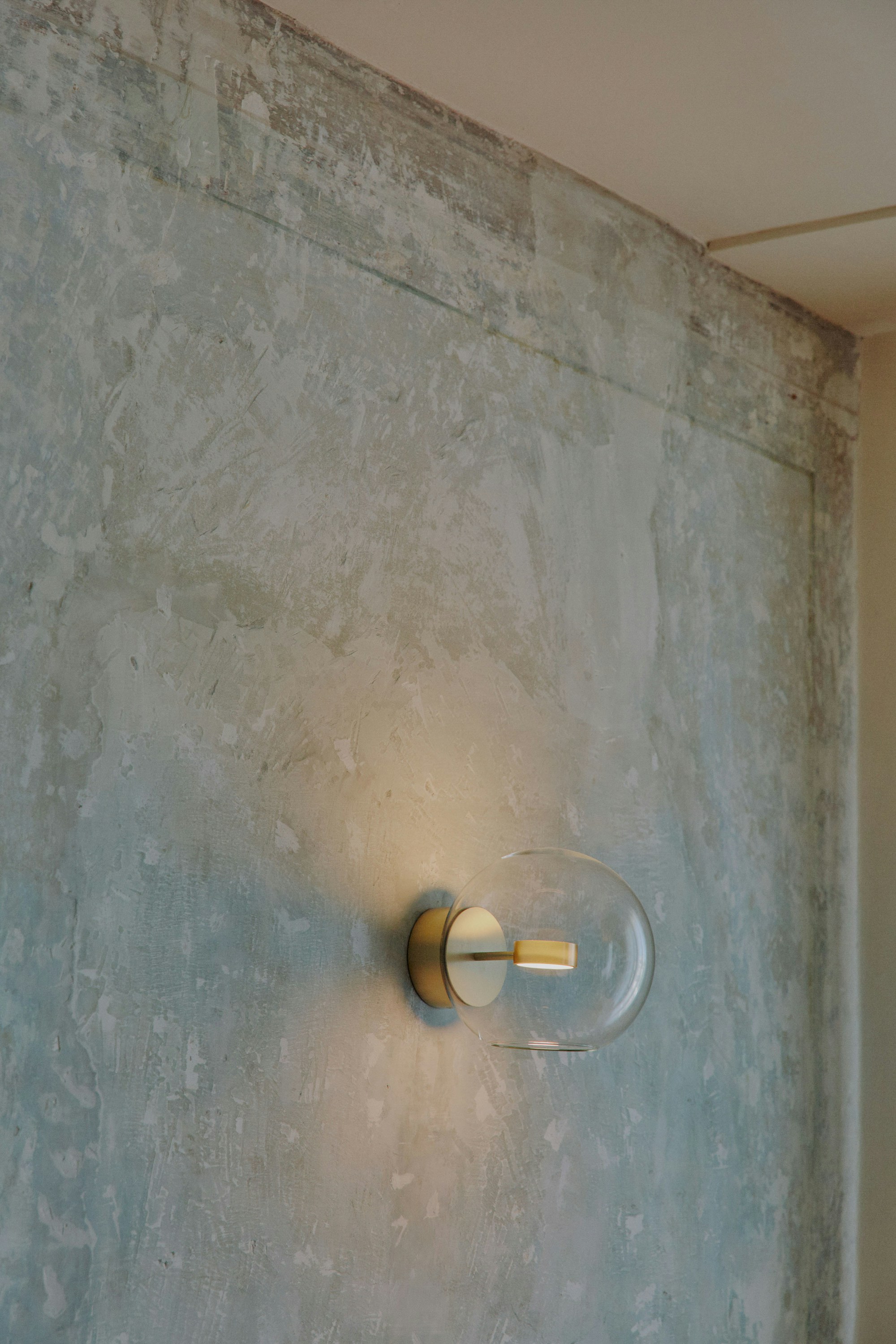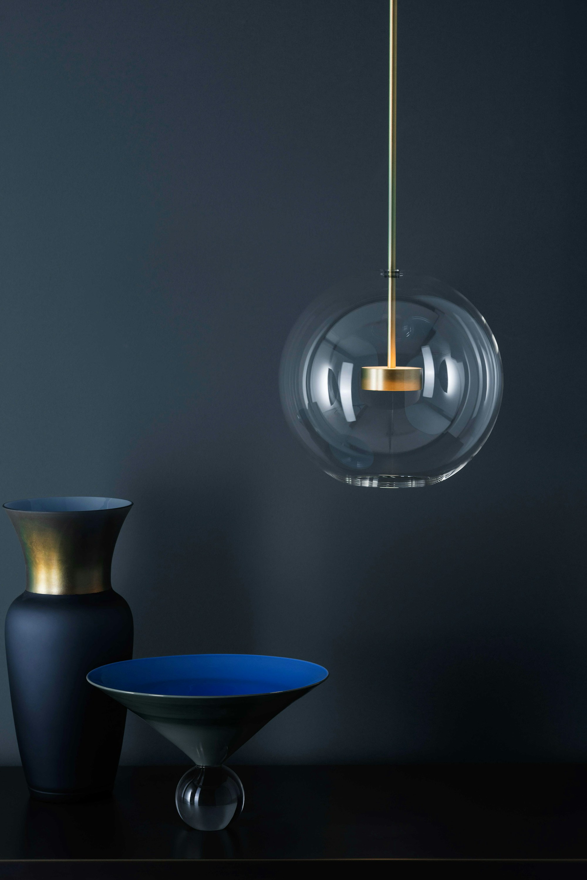 La collezione Soffio nasce da un'evoluzione dalla serie Bolle, amplificando il senso di sospensione della sfera di vetro trasparente sulla struttura in ottone.