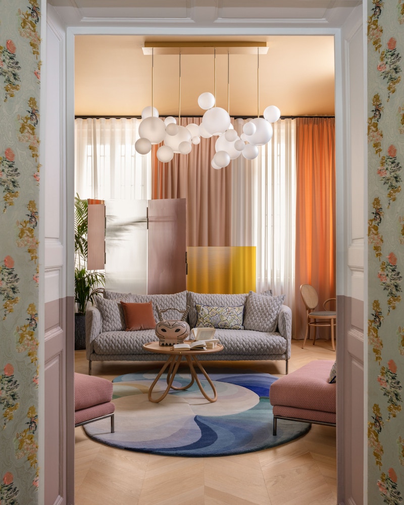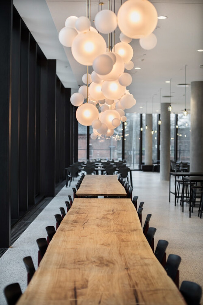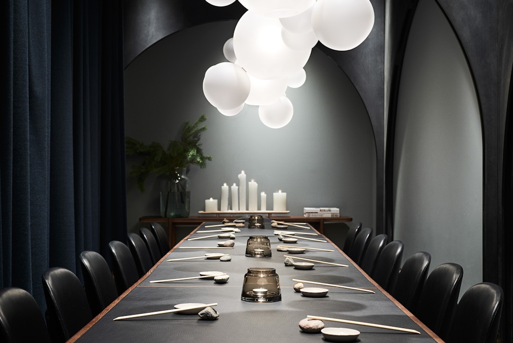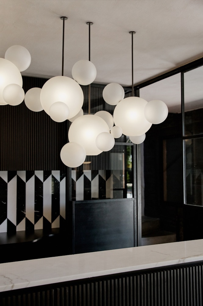 Hand-blown frosted borosilicate glass and hand-finished or electroplated brass