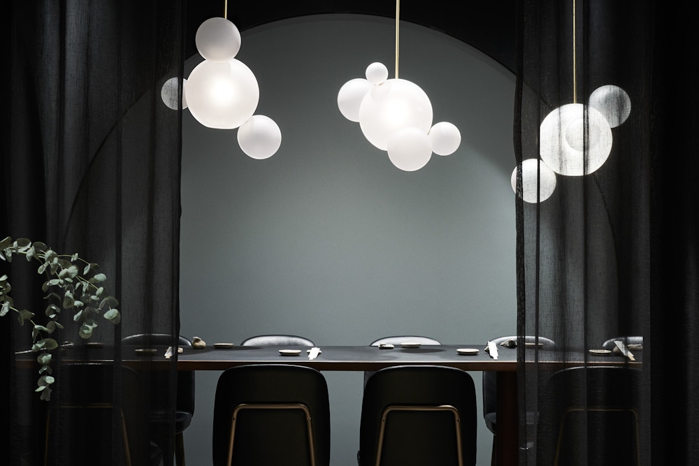 Hand blown frosted borosilicate glass and hand-finished or electroplated brass