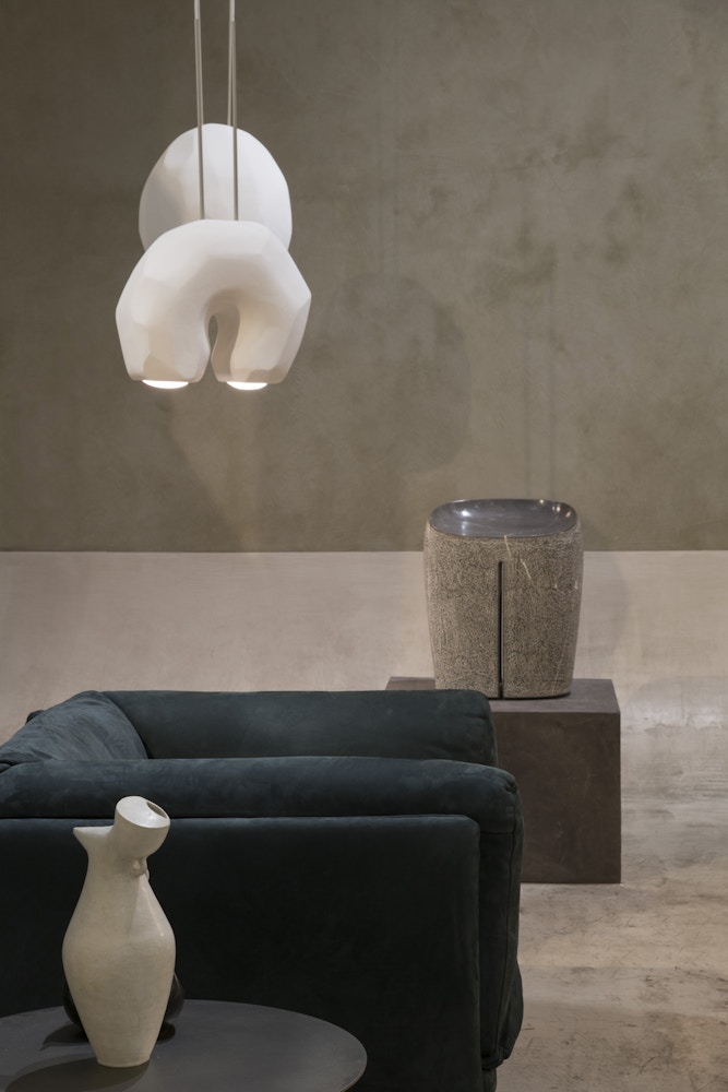 Handmade fiberglass with marble dust finish, thermoformed glass with handmade Battuto finish